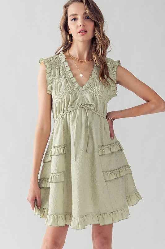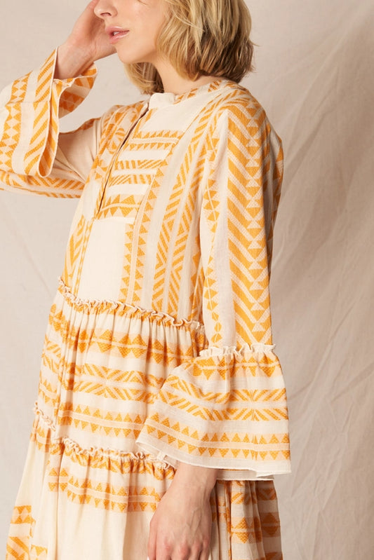 3/4 Sleeve V-Neck Jacquard Tiered Mini Dress